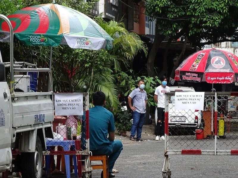 Lực lượng chức năng phong tỏa, cách ly một block ở chung cư 1A-1B đường Nguyễn Đình Chiểu (quận 1) sau khi bệnh nhân 92 tái dương tính. Ảnh: HT
