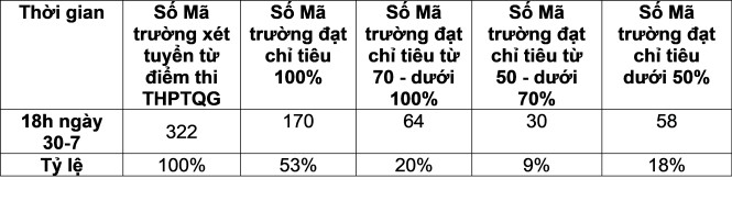 Trong thời gian từ 26-7 đến 30-7, các trường, nhóm trường với 322 mã tuyển sinh đã thực hiện xét tuyển. Kết quả đạt được như sau: