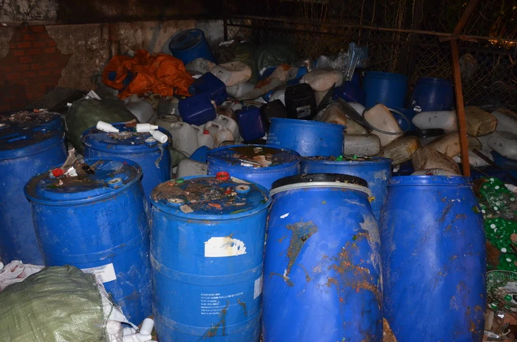 Nhiều thùng phuy hóa chất tại hiện trường vụ nổ. Ảnh: HT