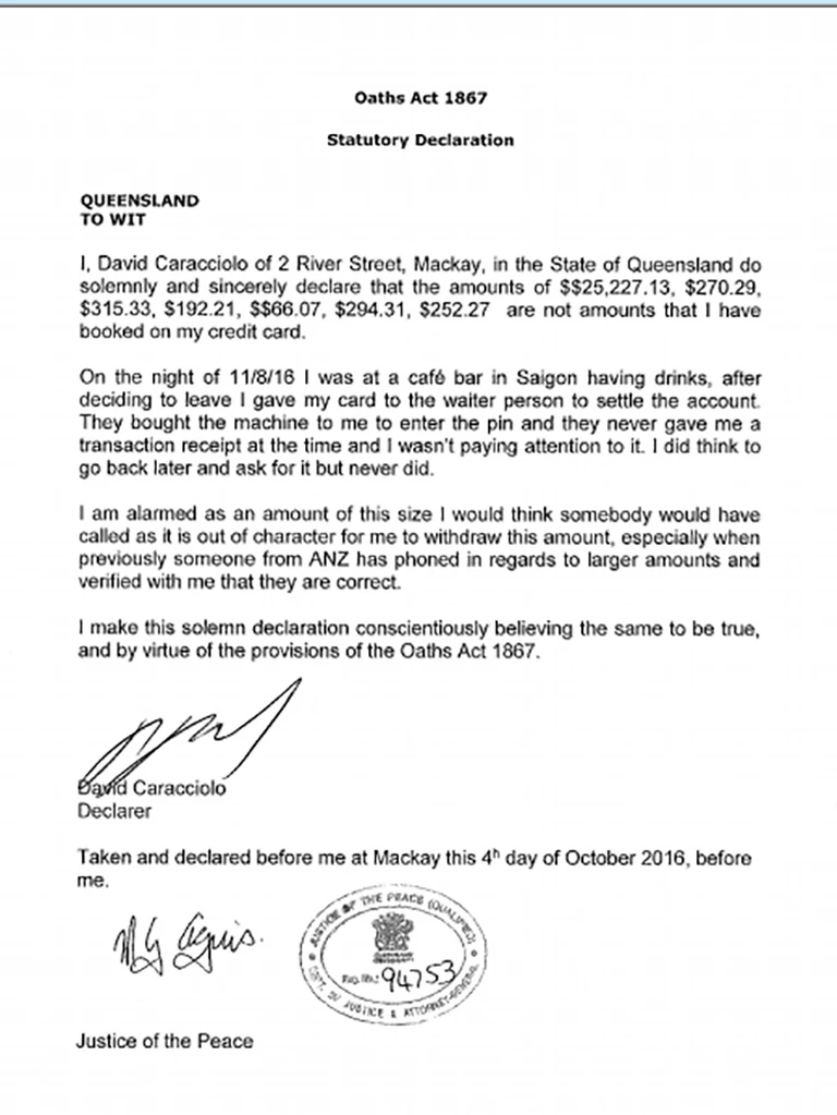 “Tối 11-8-2016, tôi đã sử dụng dịch vụ ăn uống tại một quán cà phê nhỏ tại Sài Gòn, trước khi muốn rời khỏi tôi đã đưa thẻ ngân hàng của tôi cho người phục vụ nhằm thanh toán tiền. Sau đó họ đưa tôi máy thanh toán để nhập mã pin và không đưa hóa đơn thanh toán hay chứng từ chuyển tiền trong lúc tôi không để ý. Tôi đã có ý định trở lại sau đó để hỏi nhưng tôi chưa làm. Tôi thật sự hoảng hốt về mức giá mà tôi thanh toán. Tôi nghĩ ai đó phải giải thích cho tôi về sự việc này nhưng khi nhân viên ngân hàng ANZ thông báo với tôi qua điện thoại rằng họ hoàn toàn chính xác về số tiền mà tôi phải chuyển để thanh toán cho ngân hàng phía Việt Nam” - theo bản dịch tiếng Việt lời ông John tuyên thệ được chứng nhận trước cơ quan pháp luật tại Liên bang Úc ngày 4-10-2016.