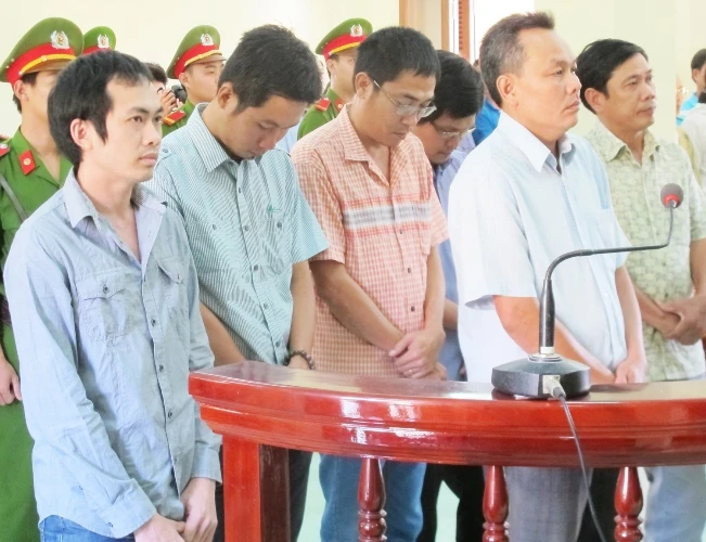 Năm bị cáo trong phiên tòa ngày 7-5. Bị cáo Thành bìa trái hình. Ảnh: Tấn Lộc