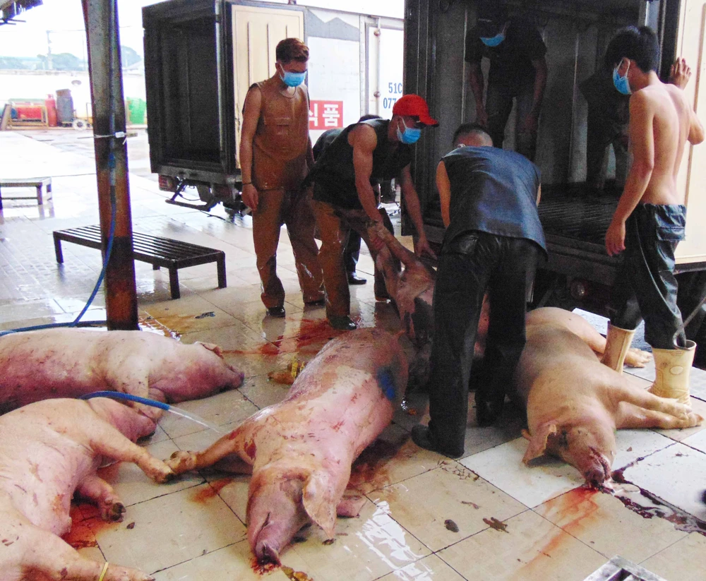 Heo tiêm thuốc an thần chuẩn bị mang tiêu hủy. Ảnh: TRẦN NGỌC