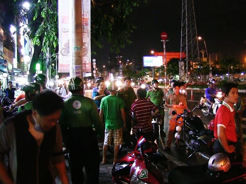 Trong đó, một tài xế GrabBike tên Trương Thái Phong đã cầm dây xích khóa xe xông vào đánh một bảo vệ và vị khống chế. Thấy vậy nhóm thanh niên còn lại xông vào dùng nón bảo hiểm đánh các bảo vệ.