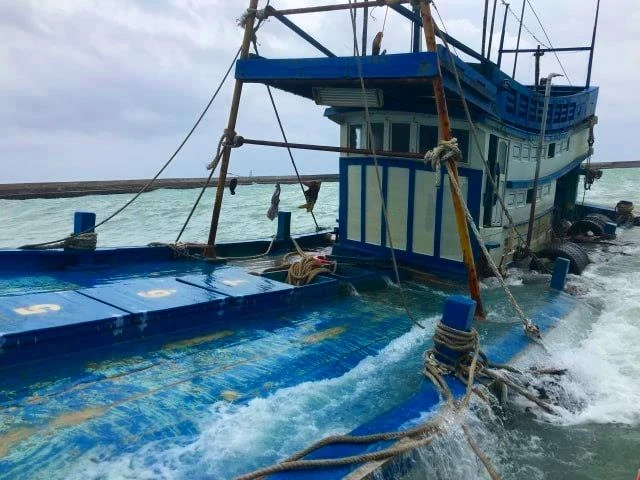 Như PLO đã đưa tin, khoảng 17 giờ 30 chiều 1-7, tàu dịch vụ hậu cần nghề cá BV 98459 TS công suất 480CV chở khoảng 70.000 lít dầu D.O đang neo đậu tại cảng Phú Quý thì bị mắc cạn rồi chìm dần tại cảng. Trên tàu lúc xảy ra sự cố có 7 người, trong đó có 5 thuyền viên và 2 cán bộ biên phòng đang làm nhiệm vụ giám sát.