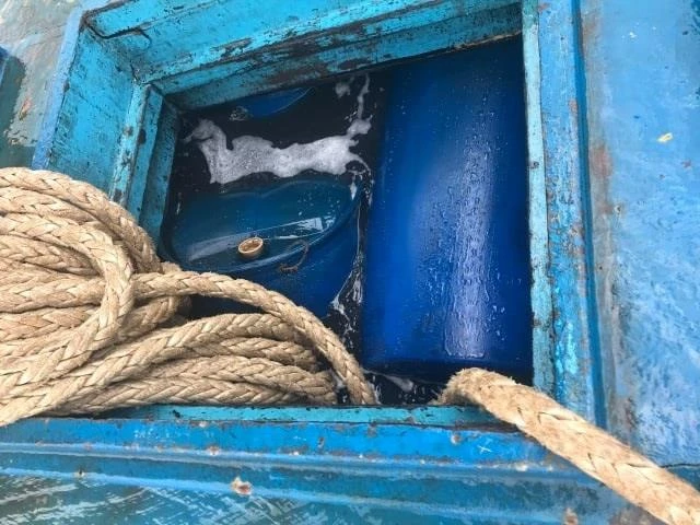 Đây là số dầu trên không rõ nguồn gốc, tàu bị Bộ đội biên phòng Bình Thuận bắt giữ và đưa vào neo đậu tại cảng Phú Quý để phục vụ điều tra.