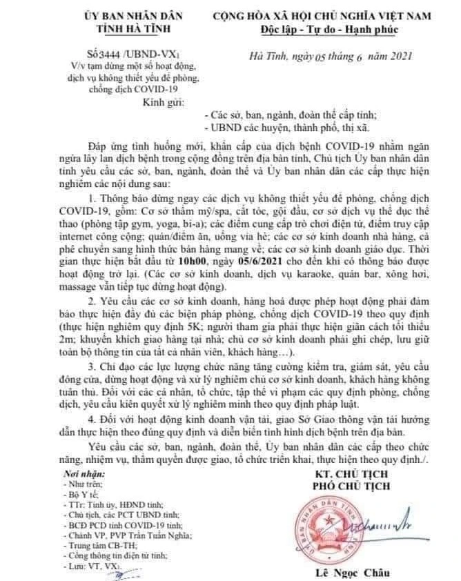 UBND tỉnh Hà Tĩnh đã có công văn tạm dừng một số hoạt động, dịch vụ không thiết yếu để phòng, chống dịch COVID-19.