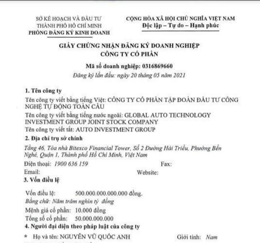 (1) CTCP Tập đoàn Đầu tư Công nghệ Tự động Toàn Cầu, mã số doanh nghiệp: 0316869660, đăng ký lần đầu ngày 20-5-2021; địa chỉ trụ sở: Tầng 46, Tòa nhà Bitexco Financial Tower, số 2 Hải Triều, phường Bến Nghé, quận 1, TP.HCM. Người đại diện theo pháp luật: Ông Nguyễn Vũ Quốc Anh. VĐL: 500.000 tỷ đồng;