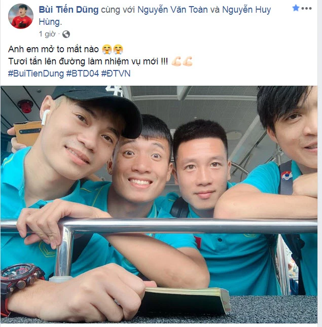 Trung vệ Bùi Tiến Dũng chia sẽ bức ảnh chụp cùng Văn Toàn, Huy Hùng, Tuấn Anh trước giờ đội tuyển Việt Nam sang Bali.