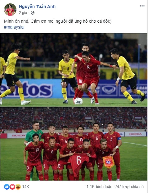 Trong buổi sáng nay, đích thân Tuấn Anh đã lên tiếng trấn an người hâm mộ trên trang Facebook cá nhân của mình. Tuấn Anh chia sẻ, “Mình ổn nhé, cám ơn mọi người đã ủng hộ cho cả đội”.