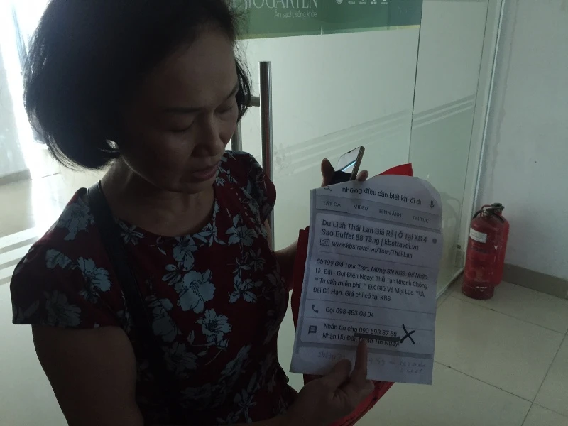 Chị Oanh, một khách hàng mua tour đi Mỹ giá 30.500.000 đồng cho hai mẹ con, kể: "Lúc mua tour, nhân viên yêu cầu phải đóng hết 100%. Tôi thắc mắc tại sao những chỗ khác chỉ đóng có một nửa thôi hoặc đưa trước 20 triệu đồng thì nhân viên trả lời là tour khuyến mãi nên cần thu tiền trước để đặt vé máy bay, chỗ ăn ở… Tôi thấy hợp lý nên cũng đóng hết 61 triệu đồng/hai người.
