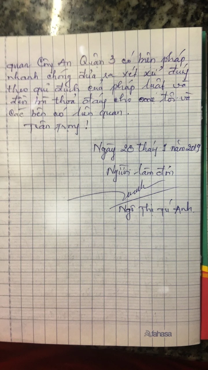 “Tôi tha thiết kính đề nghị đội trưởng Đội điều tra Công an quận 3, thủ trưởng Công an quận 3 nhanh chóng điều tra đưa ra xét xử cha con ông Hùng, Nguyên, buộc họ phải có trách nhiệm hình sự, trách nhiệm bồi thường đền bù về suy giảm sức khỏe do chấn thương này đối với mẹ tôi. Trước đây, mẹ tôi vẫn sinh hoạt lao động để lo cho cuộc sống gia đình, nay phải nằm bất động không thể làm gì được” - chị TA viết trong đơn.