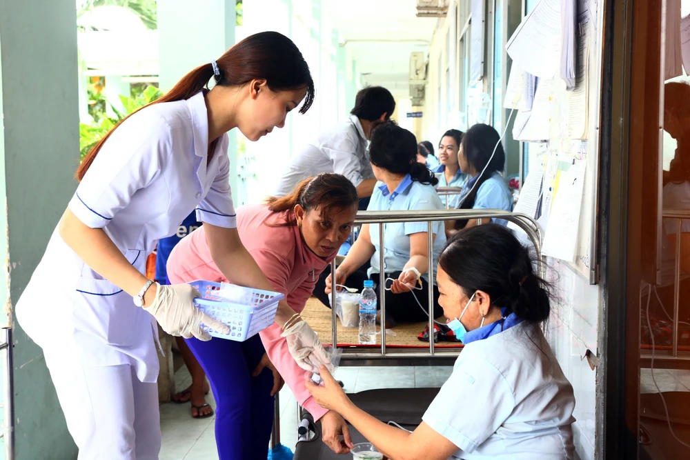 Công nhân truyền nước ngoài hành lang. Ảnh: LÊ ÁNH