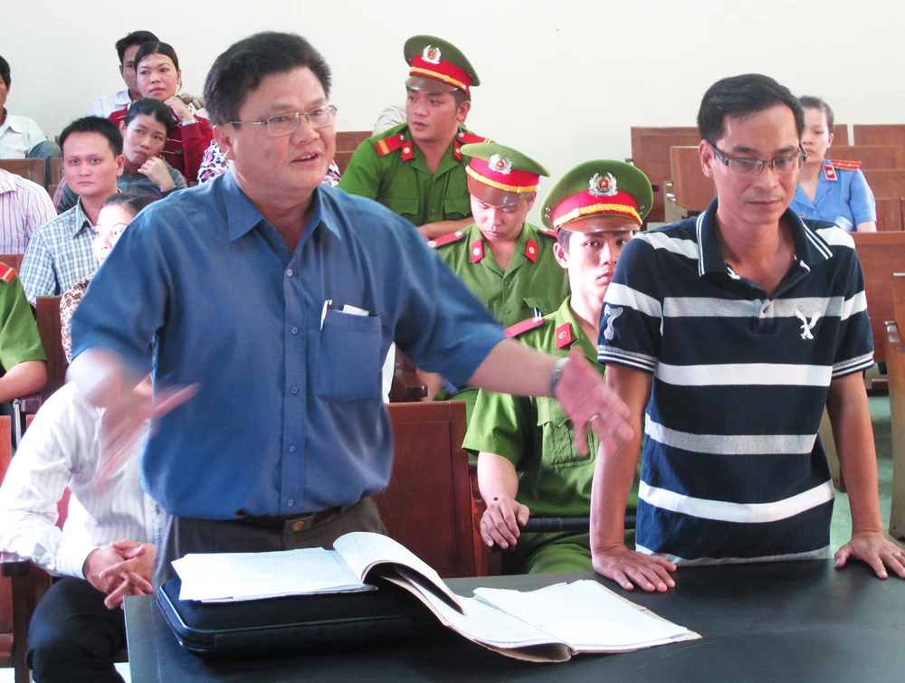 Ông Nguyễn Tâm Niệm, Phó Công an huyện Tuy An, đại diện bị đơn (bên trái) và ông Võ Văn Thái (người bị cho là tổ chức khám ngực phụ nữ trái quy định) tại phiên tòa sơ thẩm. Ảnh: TẤN LỘC