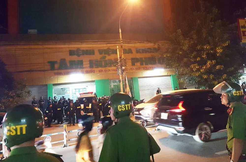 Hàng trăm cảnh sát bao vây BV đa khoa tư nhân Tâm Hồng Phước. Ảnh: VH