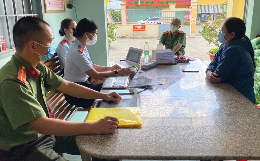 Bà Hương (phải) làm việc cơ quan công an và Thanh trả Sở Thông tin và Truyền Thông tỉnh Đồng Nai tại trụ sở Công an phường Trảng Dài. Ảnh: VH.