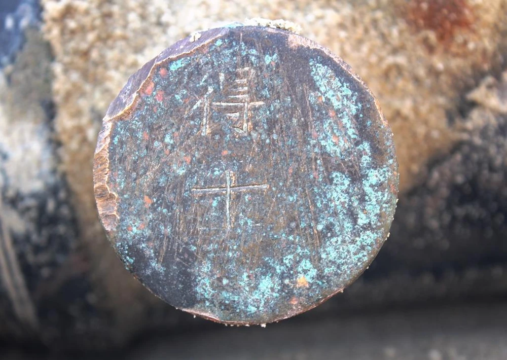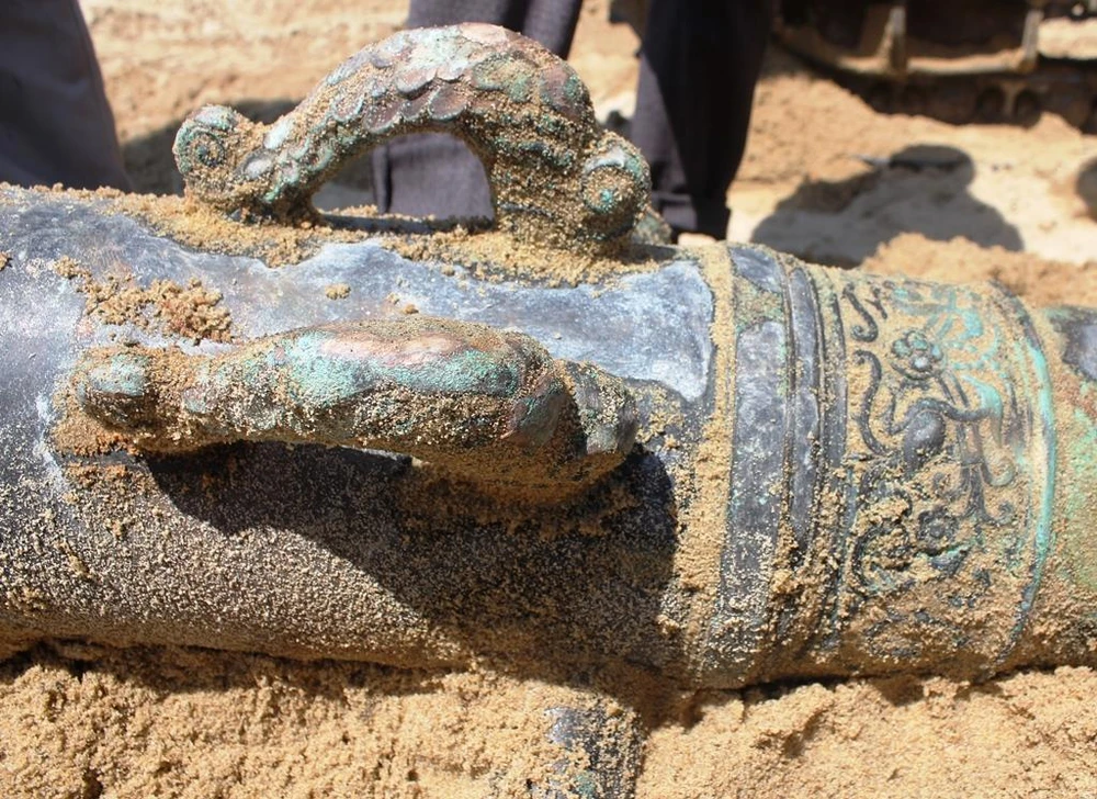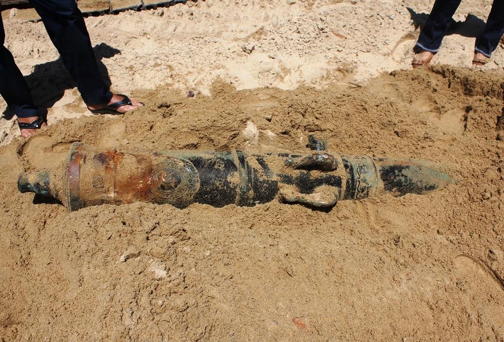 Súng thần công được phát hiện khi người dân đào đất làm kè biển. Ảnh: HẢI HIẾU