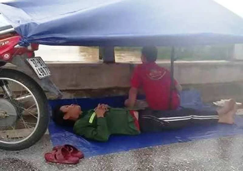 Người thân căng bạt che mưa thay nhau ngồi trên cầu dõi mắt xuống sông Lam tìm kiếm ông Đông, bà Lợi.