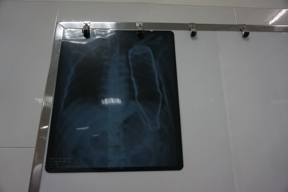 Sau khi tiếp nhận bệnh nhân, BV đã tiến hành chụp X-quang và CT, các bác sĩ ngỡ ngàng khi thấy một vỏ chai thủy tinh còn nguyên vẹn trong lồng ngực bệnh nhân B.