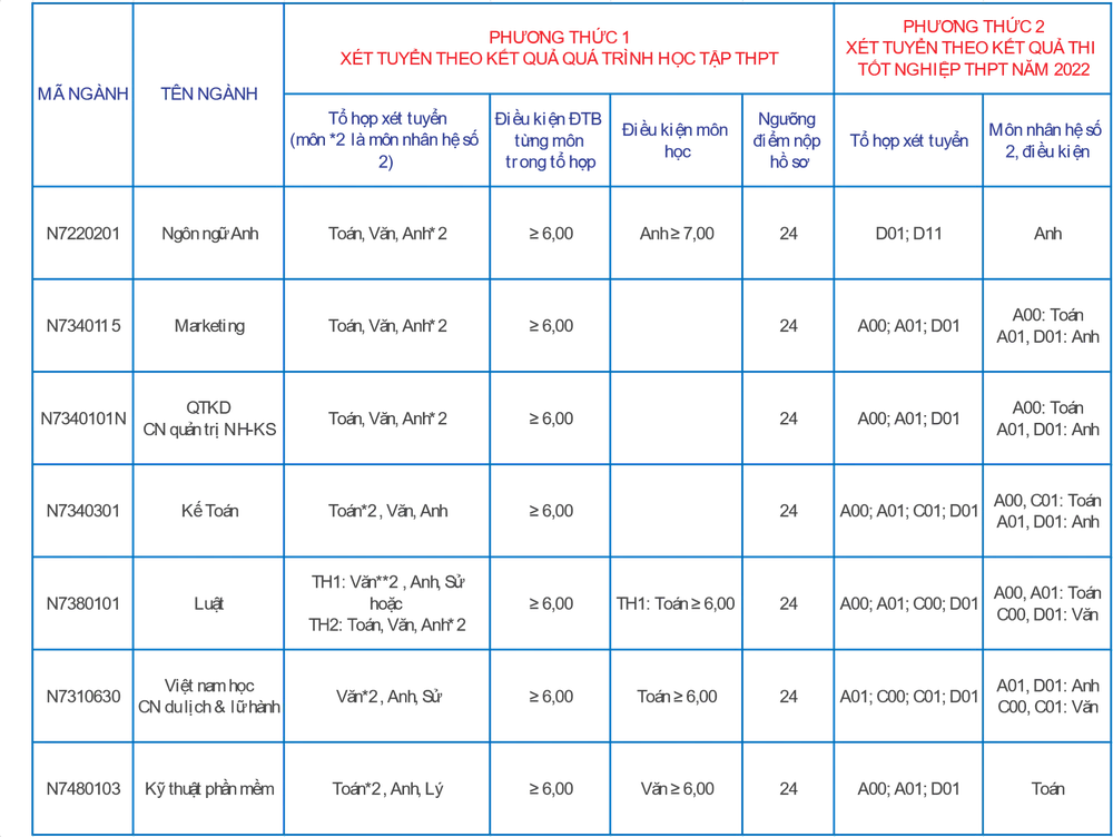 Các phương thức xét tuyển năm 2022: