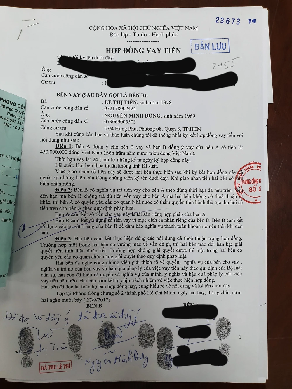 Một trong các hợp đồng vay tiền mà vợ chồng ông Đông thực hiện tại Phòng công chứng số 2 vào năm 2017. Ảnh: SONG NGUYỄN