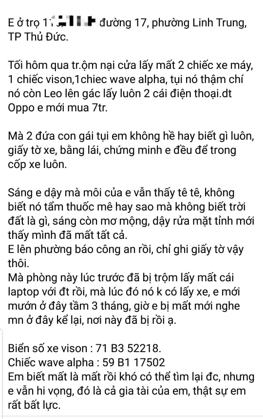 Theo trình báo của hai cô gái, rạng sáng 24-2, khi hai cô gái đang ngủ thì trộm đã đột nhập vào phòng trọ tại đường 17, phường Linh Trung lấy hai xe máy. Táo tợn hơn, kẻ trộm còn leo lên gác lấy hai cái điện thoại để trên đầu gối khi hai cô gái đang ngủ say.