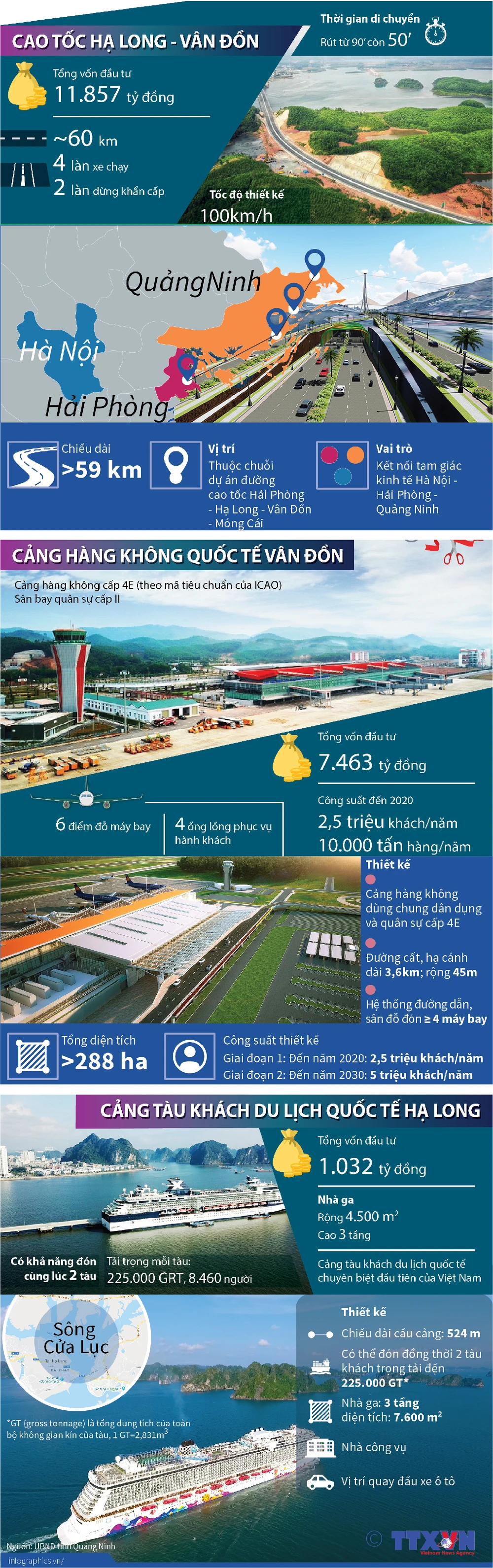 3 dự án giao thông có tổng giá trị đầu tư 25.000 tỉ đồng gồm: Dự án cao tốc Hạ Long - Vân Đồn, Cảng hàng không quốc tế Vân Đồn và Cảng tàu hành khách quốc tế Hòn Gai của Quảng Ninh đã đi vào hoạt động ngày 30-12-2018.