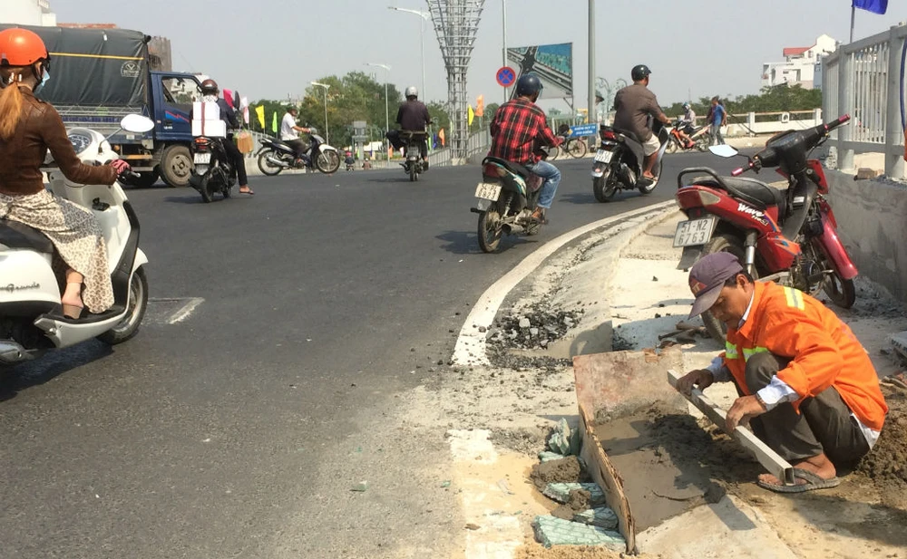 Vỉa hè góc cua theo các hướng được công nhân hoàn thiện trong ngày 29-1