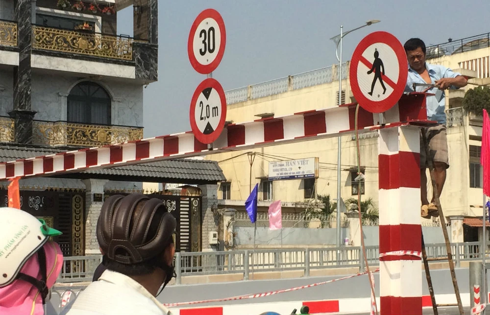 Trong ngày 20-1, công nhân hoàn thiện hệ thống biển báo qua phần hầm trực thông với các biển báo giới hạn độ cao 2m, tốc độ cho phép lưu thông qua hầm 30 km/giờ và cấm người đi bộ qua hầm
