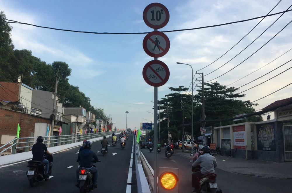 Xe có tổng tải trọng từ trên 10 tấn, xe thô sơ và người đi bộ bị cấm đi lên nhánh cầu vượt này.