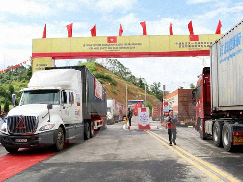 Xe vận tải xuất nhập khẩu hàng hóa lưu thông trên tuyến đường mới tại cửa khẩu quốc tế Hữu Nghị. Ảnh: TTXVN