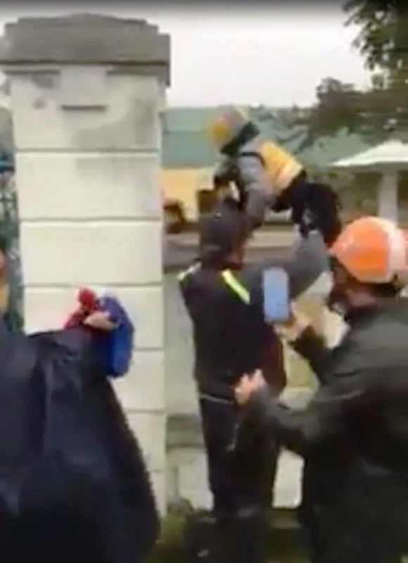 Bế học sinh vượt qua tường rào nhà trường để vào lớp học. Ảnh cắt từ video clip.
