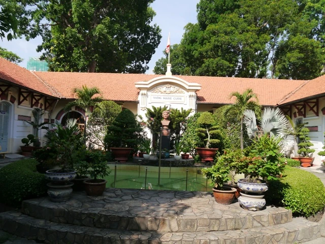 Nổi bật với nét kiến trúc cổ điển, tiêu biểu cho lối xây dựng theo phong cách Pháp xen lẫn là lối trang trí mang hơi hướng truyền thống Á Đông, trường THPT Marie Curie khoác lên mình vẻ đẹp cổ kính, hết sức thơ mộng dưới những đường nét trang trí, chấm phá tinh tế cao. Dạo bước từ phía cổng chính, ngay trước khu học đường là một khuôn viên nhỏ với bức tượng nhà khoa học Marie Curie đặt trang trọng ở giữa. Khoảng kiến trúc xanh này như để tách biệt trường học với bên ngoài, tạo sự yên tĩnh cho công việc giảng dạy cũng như học tập đạt được kết quả cao nhất.