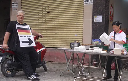 … và cách tiếp thị của anh bạn Đức này cũng khá “độc”! “Nhảy” xuống lề đường, đeo trước ngực một tấm bảng phía trên là quốc kỳ Đức, dòng chữ Việt “xúc xích Đức” ở giữa và dưới cùng là mũi tên, còn tay trái anh chỉ vào vỉa hè như muốn nói: Xin mời! Xin mời…!