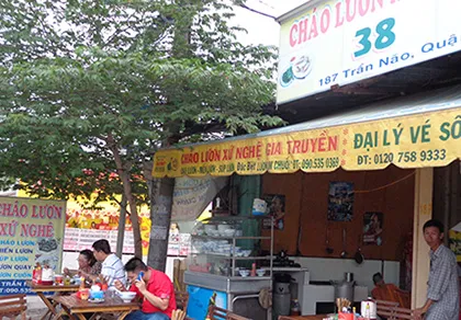 Mỗi con người xa xứ mang món ngon quê mình vào Sài Gòn đều “khẳng định” đó là “hàng” gia truyền, như thịt chó gia truyền Nam Định, phở gia truyền Quán Sứ (Hà Nội)… và đây là anh bạn cháo lươn gia truyền xứ Nghệ. Để “phân tách” và chỉ dấu cho bạn đồng hương Hà Tĩnh, anh bạn cháo lươn “trưng” luôn con số đầu 38 của biển số xe (Nghệ An là 37) lên bảng hiệu.