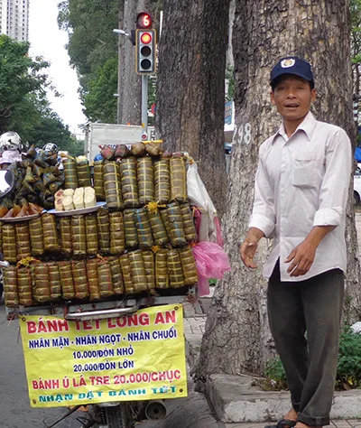 Cũng có khi nhìn dáng người và hàng là biết người từ đâu “nhập” về Sài Gòn. Như anh chàng bán bánh tét Long An này có dáng đặc sệt Hai Lúa thì đích thị đến từ Long An rồi! Bánh tét của anh ta có đủ các loại nhân mặn, ngọt và chuối (để cho những người ăn chay). Và nữa anh còn trưng dòng chữ “nhận đặt bánh tét”. Em sẽ bảo, trời anh ta bán hàng rong chạy long nhong khắp Sài Gòn thì làm sao dám đặt? “Em sẽ đưa bánh đặt đến tận nhà anh Hai đúng ngày, giờ, rùi mới lấy tiền!”- Ảnh nói. Nghe mà thương quá người miền Tây vẫn giữ chất lam lũ, chân chất khi mưu sinh giữa Sài Thành, em nhỉ!
