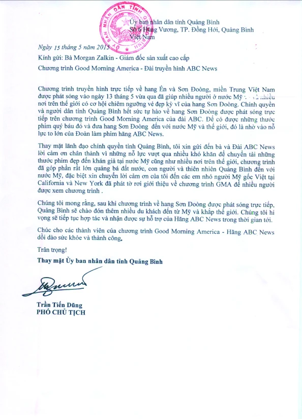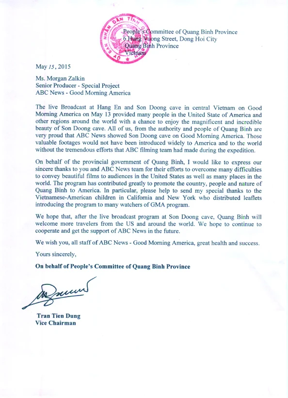 Nội dung bức thư ông Trần Tiến Dũng ký có đoạn: “Chương trình trực tiếp về hang Én và Sơn Đoòng, miền Trung Việt Nam được phát sóng vào ngày 13 tháng 5 vừa qua đã giúp nhiều người ở nước Mỹ và nhiều nơi trên thế giới có cơ hội chiêm ngưỡng vẻ đẹp kỳ vĩ của hang Sơn Đoòng. Chính quyền và nhân dân tỉnh Quảng Bình hết sức tự hào về hang Sơn Đoòng được phát sóng trực tiếp trên chương trình Good Morning America của ABC. Để có được những thước phim quý báu đó và đưa hang Sơn Đoòng đến với nước Mỹ và thế giới, đó là nhờ vào nỗ lực to lớn của đoàn làm phim hãng ABC News”.