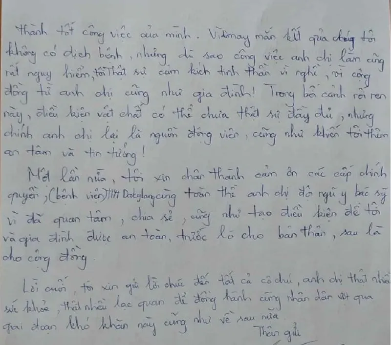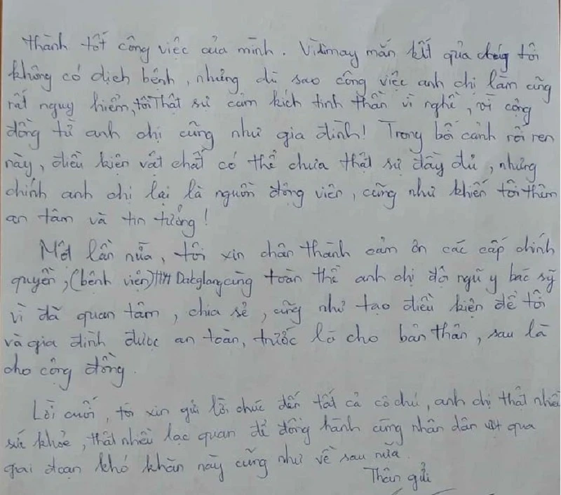 Cũng theo bức thư, chị và gia đình may mắn không bị dịch bệnh. Nhưng chị rất cảm kích tinh thần vì nghề, vì cộng đồng của đội ngũ y bác sĩ nơi chị cách ly.