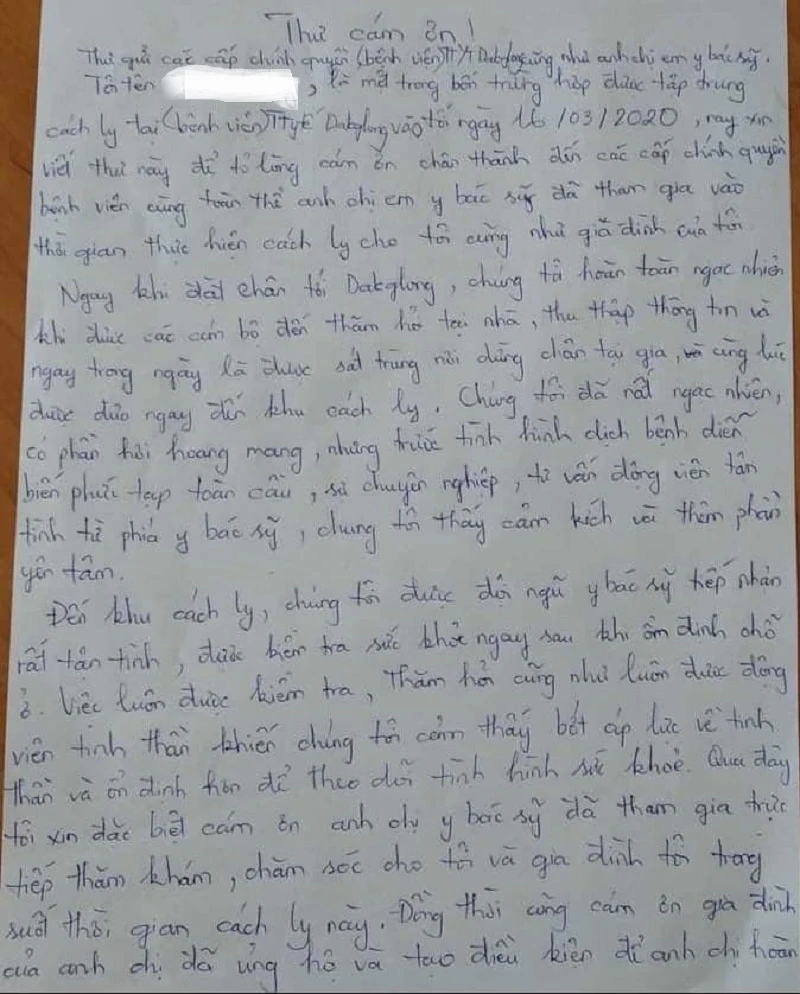 Nội dung bức thư thể hiện lòng biết ơn của chị cùng gia đình đối với chính quyền cũng như toàn thể bác sĩ ở trung tâm y tế huyện trong thời gian chị cùng gia đình cách ly.