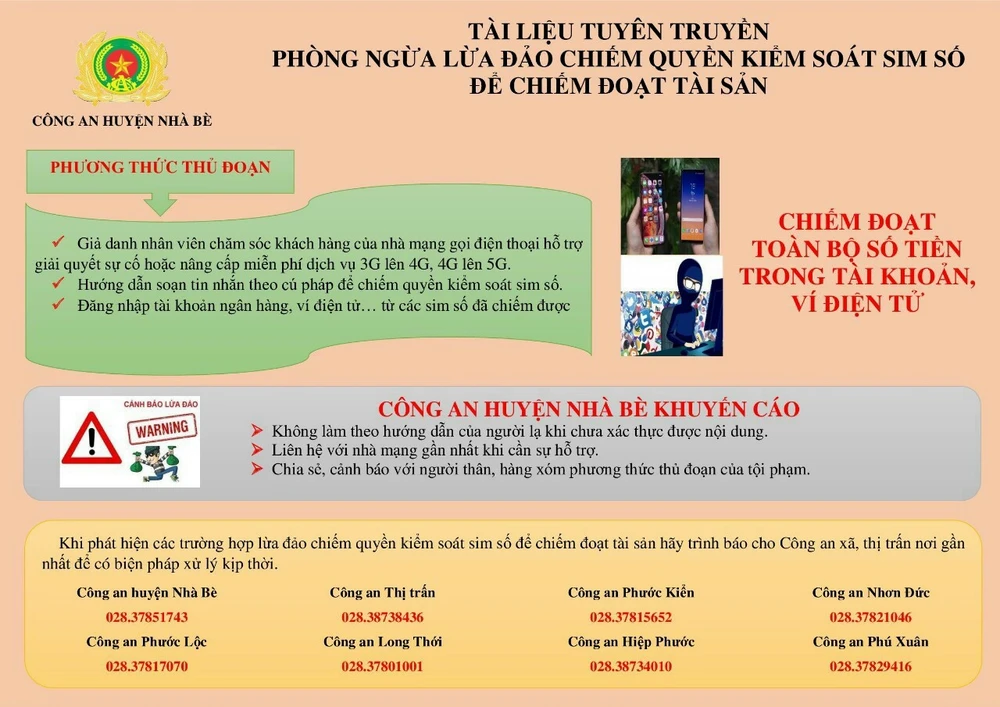 Công an huyện Nhà Bè, TP.HCM khuyến cáo người dân phòng ngừa với thủ đoạn lừa đảo chiếm quyền kiểm soát sim điện thoại để chiếm đoạt tài sản.