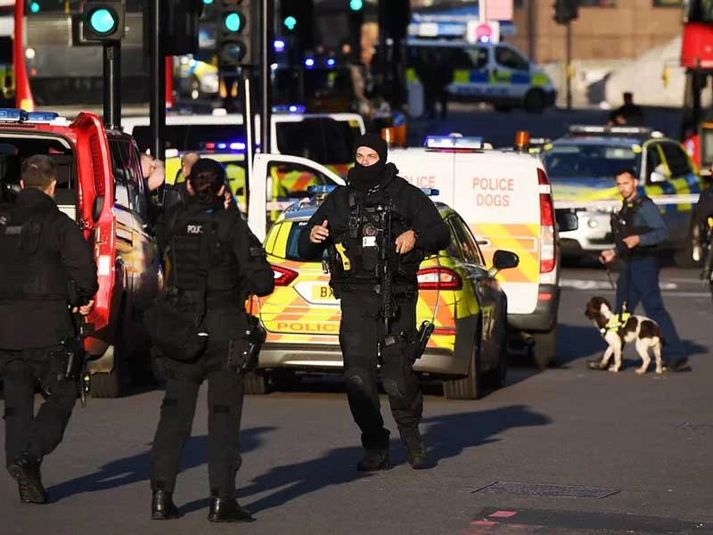 Cảnh sát Anh làm nhiệm vụ tại hiện trường vụ tấn công bằng dao ở cầu London hồi tháng 11-2019. Ảnh: THE SUN