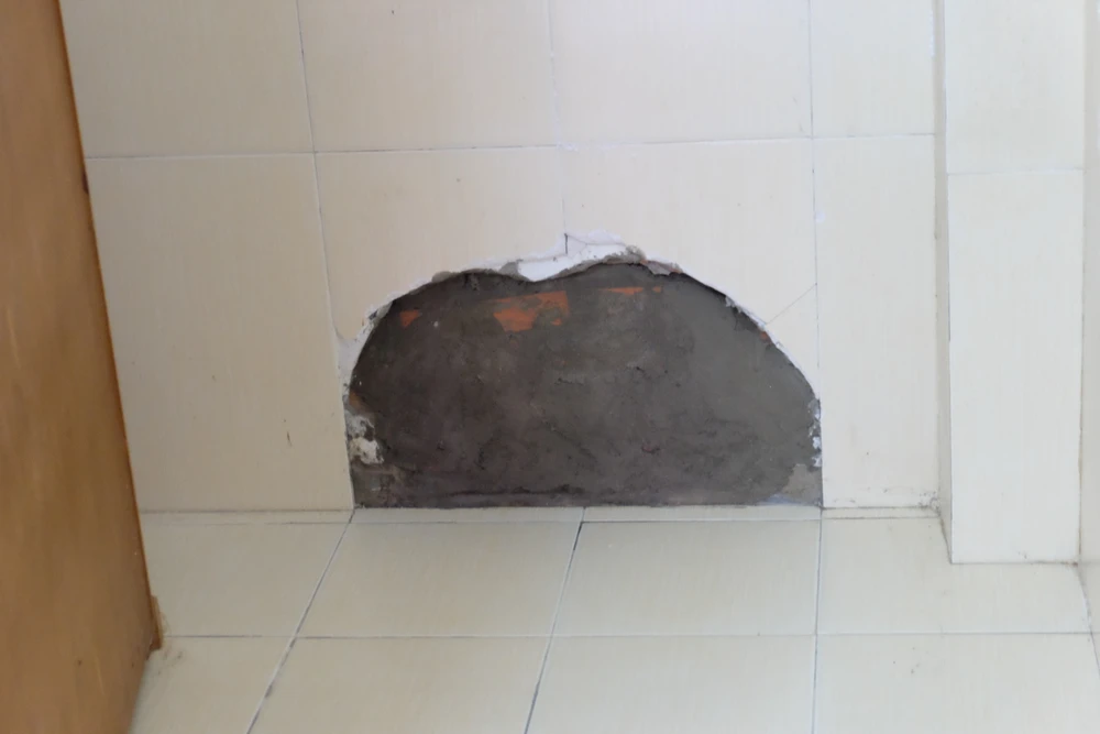 Lỗ hổng bên một góc tường đã được chủ nhà trám lại.