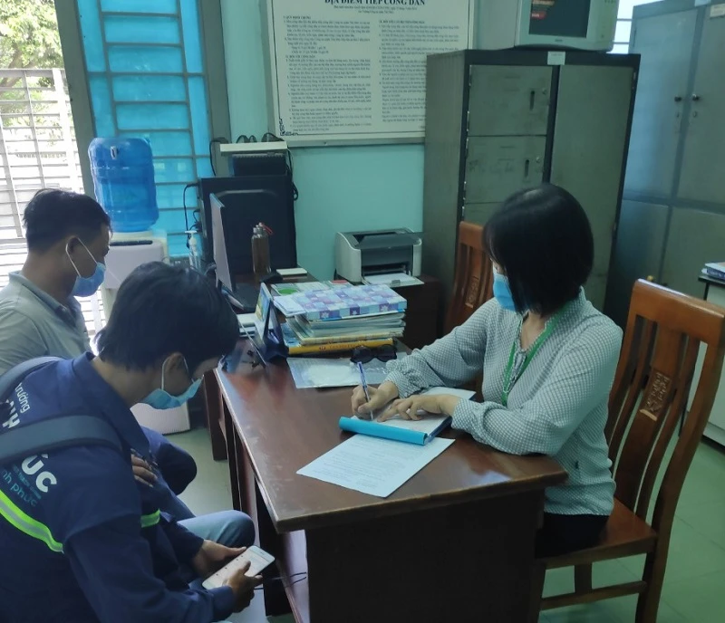 Khi kiểm tra một công trình xây dựng trên đường Kha Vạn Cân, phát hiện có hai công nhân đang làm việc nhưng không đeo khẩu trang, tổ công tác đã lập biên bản, phát khẩu trang cho hai người này và mời về trụ sở để làm việc.