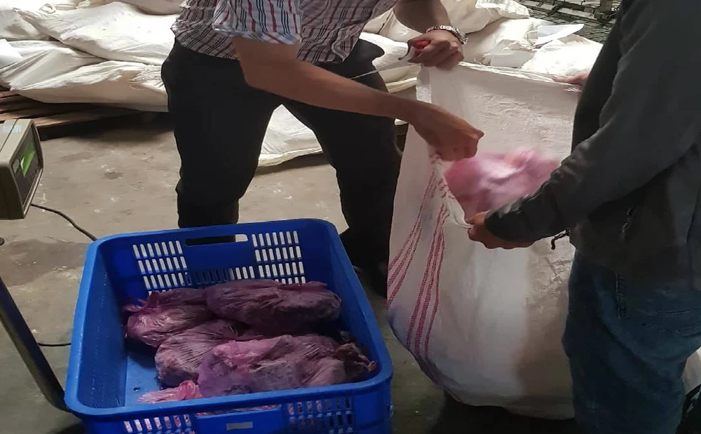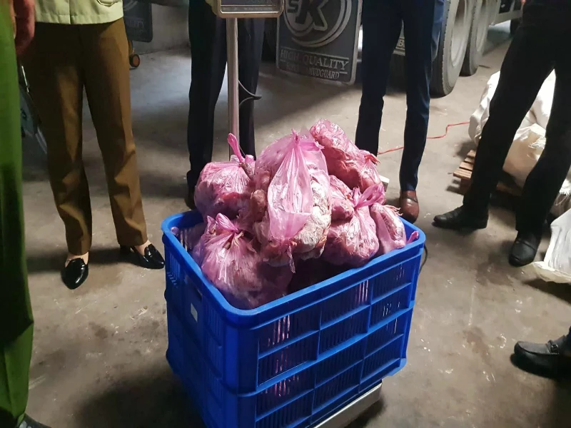 Tại đây, lực lượng chức năng phát hiện số lượng lớn thịt động vật không rõ nguồn gốc. Cụ thể: 729 kg đầu gà đông lạnh hết hạn sử dụng, 612 kg thực phẩm (dê, chim, vú heo, chân gà, mực, bò viên…) không rõ nguồn gốc.