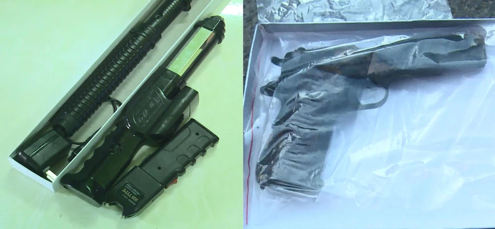 Tang vật thu giữ gồm súng bắn đạn bi sắt, roi điện và nhiều dụng cụ dùng để sử dụng, phân chia ma túy.