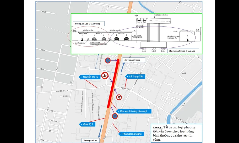 Cụ thể, đoạn quốc lộ qua khu vực này theo hướng An Sương đến An Lạc sẽ bị rào chắn một phần. Khi đó giao thông tại khu vực này sẽ được điều chỉnh như sau:
