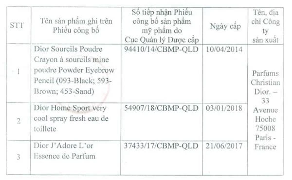 Ba sản phẩm của Dior bị đình chỉ lưu hành, thu hồi tại Việt Nam. (Nguồn: Cục Quản lý dược)