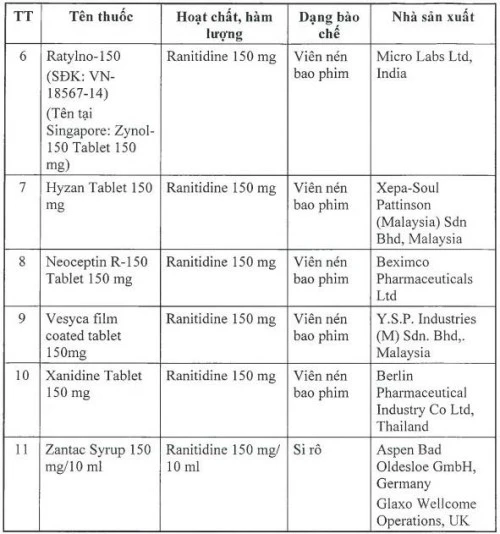 11 loại thuốc thu hồi có hàm lượng ranitidine 150 mg/10 ml, 150 mg/25 ml và loại 150 mg, xuất xứ từ Ấn Độ, Tây Ban Nha, Ý, Anh, Thái Lan, Malaysia.