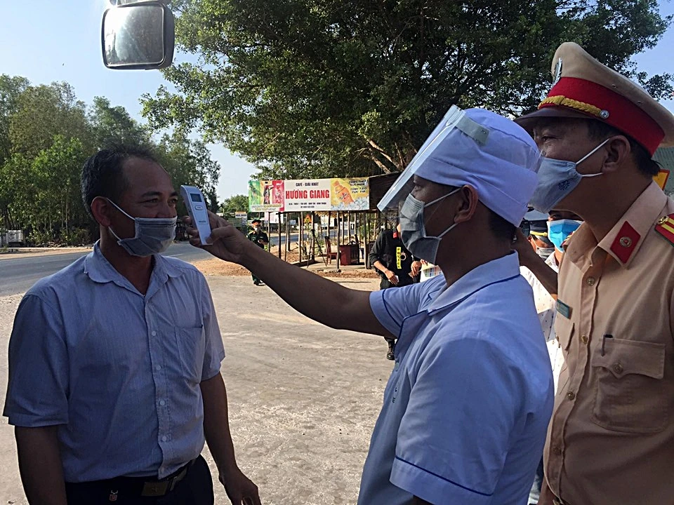 Đo thân nhiệt một tài xế xe khách.