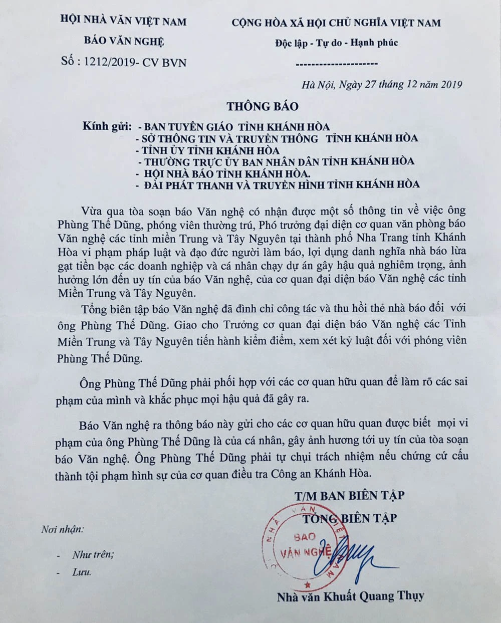 Công văn do nhà văn Khuất Quang Thụy, Tổng biên tập báo Văn Nghệ, ký cho biết vừa qua báo Văn Nghệ nhận được thông tin ông Phùng Thế Dũng, phóng viên thường trú, phó Văn phòng đại diện báo Văn Nghệ tại các tỉnh miền Trung - Tây Nguyên đóng ở TP Nha Trang vi phạm pháp luật, đạo đức người làm báo.