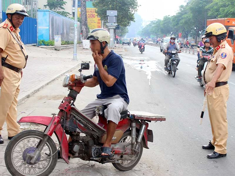 Đội CSGT Bàn Cờ (TP.HCM) xử lý các “xe mù”, “xe mờ” trên đường Lý Thường Kiệt (TP.HCM). Ảnh: LÊ THOA